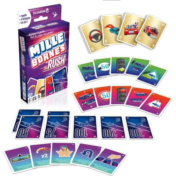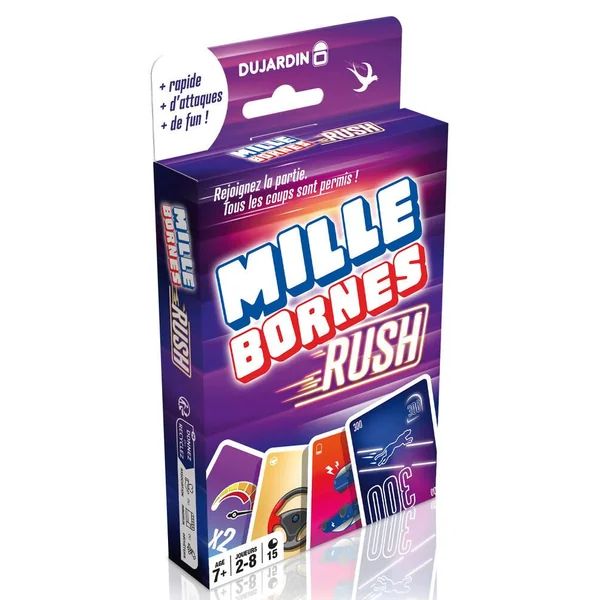Atteignez les 1000 Bornes en premier en déjouant les attaques de vos adversaires. Quelques nouvelles règles viennent pimenter vos parties : piocher dans la défausse, répliquer immédiatement à une attaque ou voler des cartes aux autres joueurs. Une partie dynamique et pleine de rebondissements !