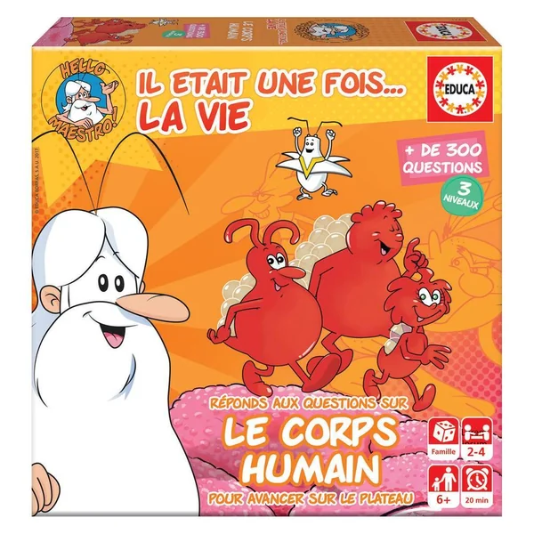 Un mini jeu de plateau éducatif basé sur la série Il était une fois… La Vie Réponds aux questions de Maestro sur le thème anatomie et biologie Avance ton pion sur le plateau quand tu as une bonne réponse. Les cartes spéciales pimenteront le jeu. De 2 à 4 joueurs. Durée de la partie 20 minutes.