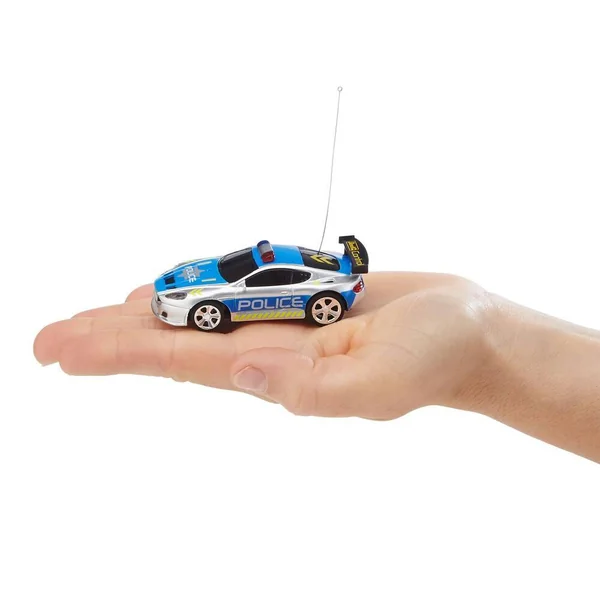 Mini voiture de Police radiocommandé 27 MHz 2 voies. Carrosserie robuste en ABS. Charge facile et rapide via la radiocommande. Batterie rechargeable intégrée NiMh 1,2V. Portée : environ 5 m. ATTENTION ! Ne convient pas aux enfants de moins de 3 ans. Risque d’asphyxie par ingestion de petites pièces.