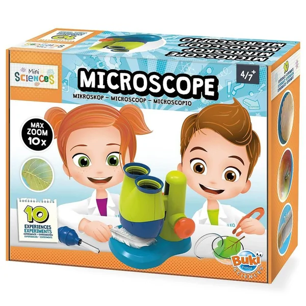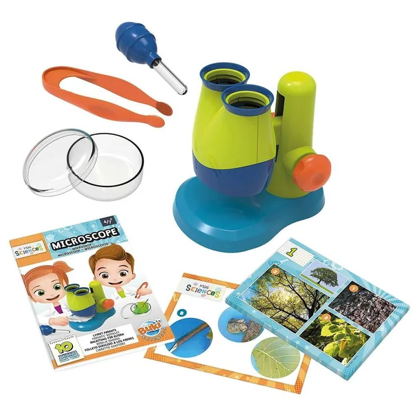 Un microscope binoculaire pour découvrir le minuscule. Place des objets de la maison sur le plateau, allume la lampe et observe facilement. Contient des accessoires adaptés aux plus petits : un microscope binoculaire grossissement X10 à éclairage LED, une pince et une boîte de Petri. Avec des 10 fiches entièrement illustrées pour les enfants et un livret à destination des parents. Nécessite 2 piles LR06 non incluses.