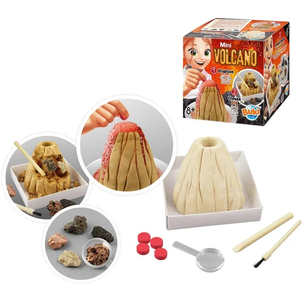 Reproduis une éruption volcanique avec les pastilles incluses. Avec les outils, creuse le volcan pour déterrer 5 pierres volcaniques. Notice illustrée en couleurs.
