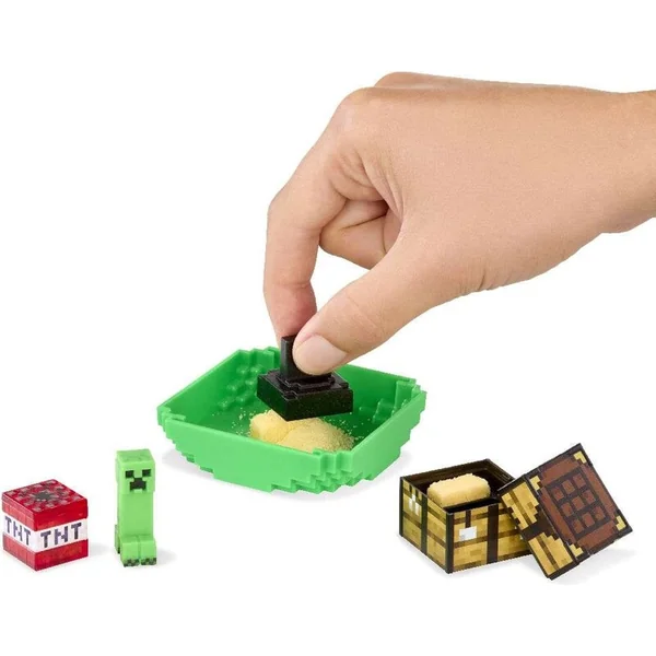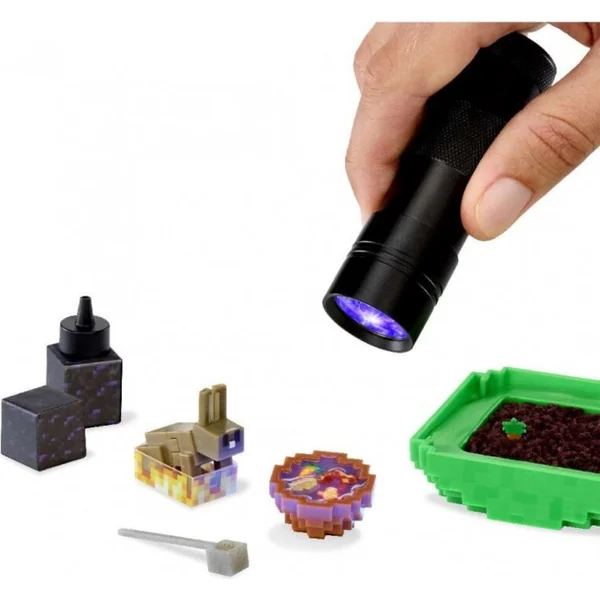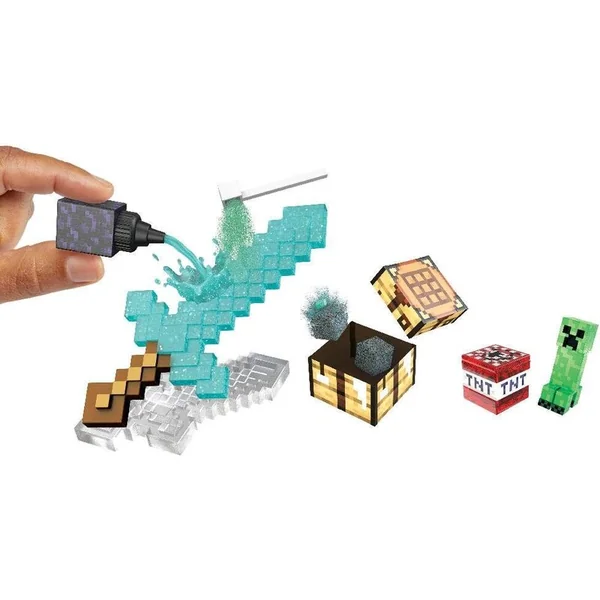 Dans l’emballage, tu trouveras le matériel et les composants pour fabriquer des objets Minecraft tels qu’une hache en bois, une pelle en fer, une épée en diamant, un arc et des flèches, un cochon, un agneau et d’autres. Tu obtiendras ainsi des répliques miniatures hyperréalistes et détaillées de Minecraft. Une fois que tu as préparé la miniature, laisse-la durcir au soleil direct ou sous une lumière UV de 365 nm pendant au moins 5 minutes.