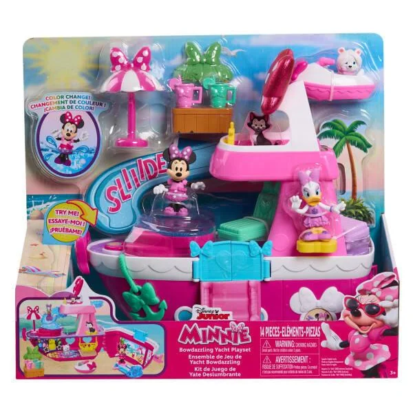 Minnie Mouse – Yatch sons et lumières 50 cm (ouvert) comprenant: 2 figurines articulées avec fonction changement de couleurs et 11 accessoires qui ferons de chaque voyage une aventure amusante. Accessoires inclus: 1 figurine chat, un toboggan, un jet ski, un set de surf, un bar exotique avec 2 boissons et 2 chaises, un hamac et un parapluie.