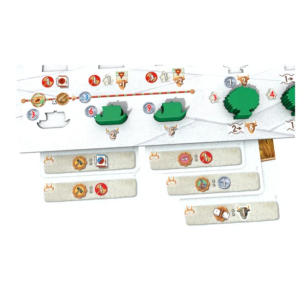 Choisissez et affectez les dés au tableau de programmation. Avec des dés de faible valeur, vous pouvez obtenir des actions plus fortes, mais les dés de valeur plus élevée vous aideront à vous hisser sur les pistes et à obtenir leurs avantages. Pendant la phase d’action, chaque joueur prend ses dés dans l’ordre, du plus élevé au plus faible, et exécute les actions prévues. Les joueurs construisent également leur tableau – chaque carte a un effet instantané et une récompense déclenchée liée à l’action spécifique ou à la valeur du dé qu’ils peuvent utiliser pour rendre l’action plus puissante. De plus, à deux reprises au cours du jeu, les joueurs obtiennent des points de victoire pour la progression de leur civilisation dans la région.