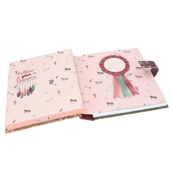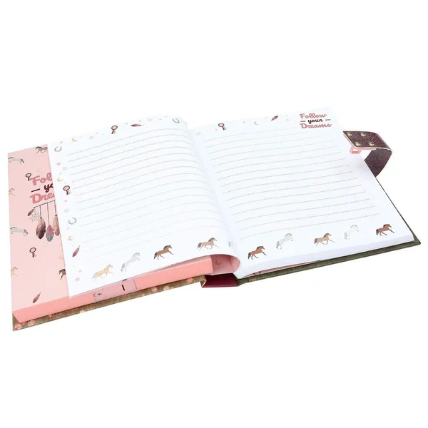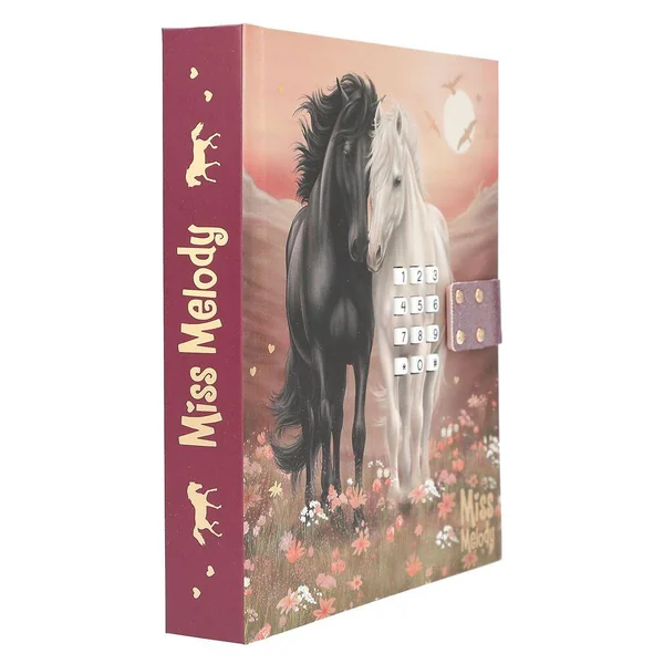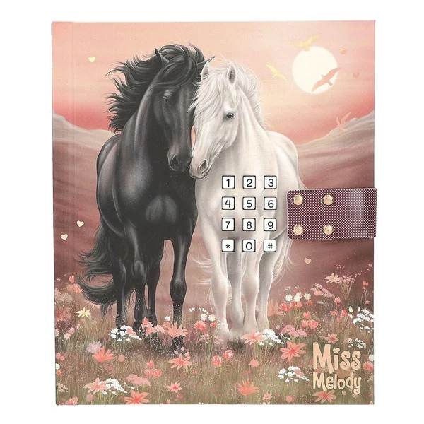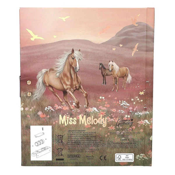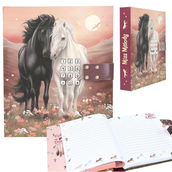 Miss Melody Journal avec code et son, motif 1Pour tes pensées et tes secrets : la couverture de ce journal intime de Miss Melody dans de douces nuances de rose et rouge présente un merveilleux motif avec deux chevaux dans un pré fleuri au coucher du soleil. L’intérieur du journal est également illustré avec amour et compte 80 pages finement lignées. Le cadenas du journal intime s’ouvre uniquement à l’entrée du bon code à quatre chiffres (à choisir et à changer par toi-même). En même temps, le tube « Wildest Dreams » de Taylor Swift sera déclenchée et jouera pendant env. 20 secondes.