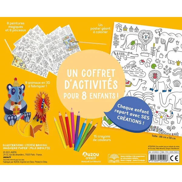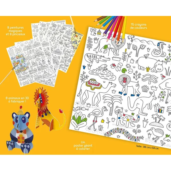 Un coffret comprenant : Une activité collective : 1 poster géant à colorier (88 x 58 cm) avec des crayons de couleurs Des activités individuelles : – 8 peintures magiques et 8 pinceaux – 8 animaux à monter en 3D Et une fiche explicative pour aider les enfants !
