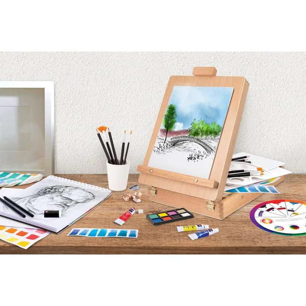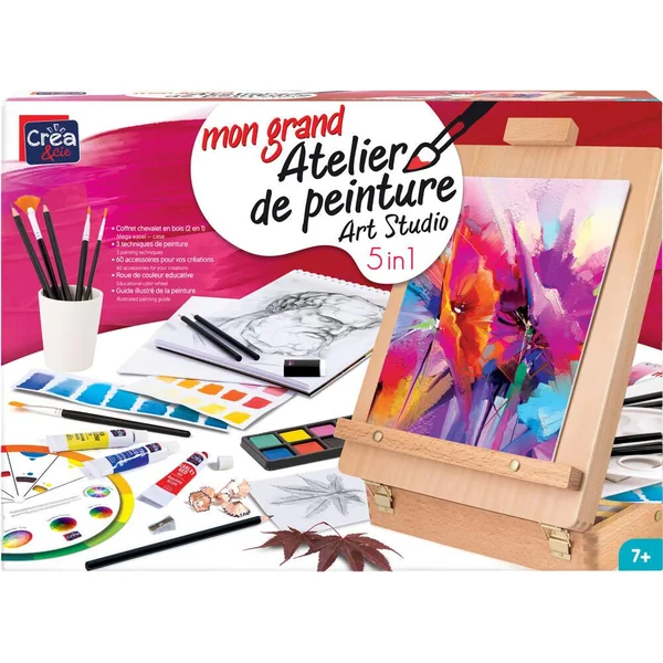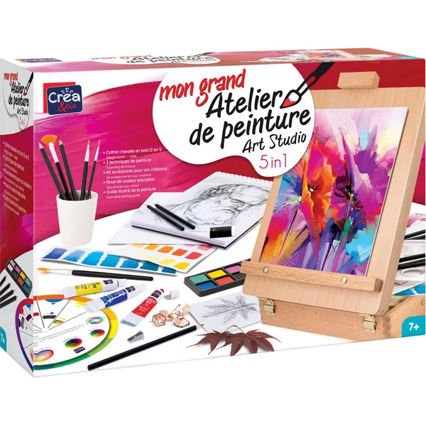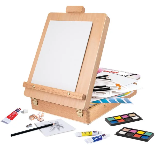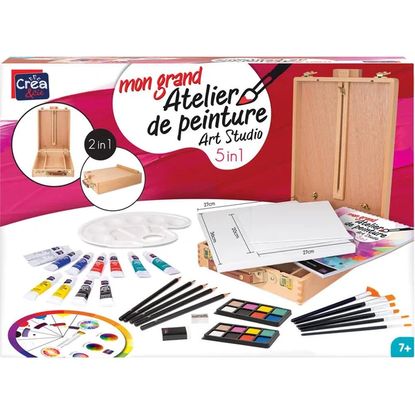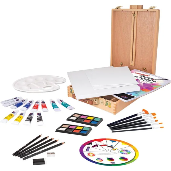 Contenu : 1 coffret-chevalet en bois, 6 pinceaux de différentes tailles-formes, 12 peintures acryliques en tubes, 16 aquarelles dans un étui, bloc à dessin avec 15 feuilles d’aquarelle, 5 crayons à dessin, 1 toile 27 cm x 36 cm, 2 panneaux de toile 27 cm x 20 cm, 1 palette, 1 gomme, 1 taille-crayon, 1 roue de couleur éducative, manuel détaillé avec des instructions pour différentes techniques de peinture.