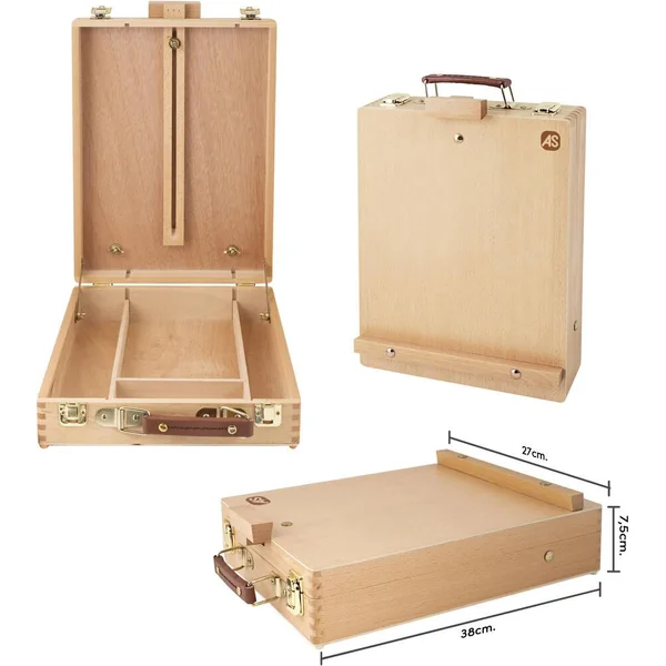 Dimensions mallette – chevalet : fermé 27 x 7.5 x 38 cm, ouvert réglé au point le plus bas 27 cm x 4,5 cm x 44 cm, ouvert réglé au point le plus haut : 27 cm x 4,5 cm x 69 cm.