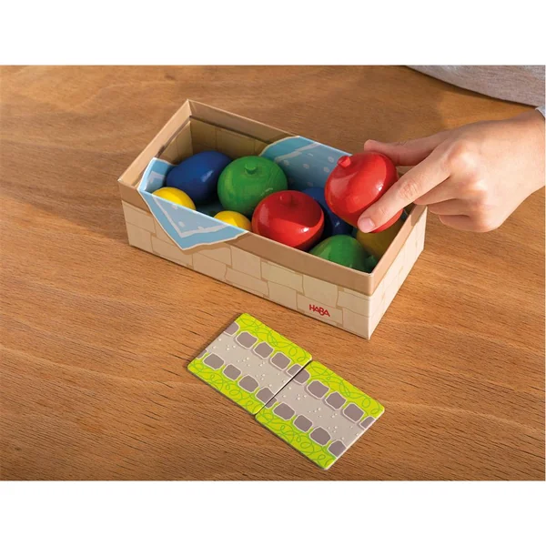 Mes premiers jeux – Mon premier verger est une adorable version pour bambins du jeu classique HABA « Le verger ». Les enfants parviendront-ils à cueillir ensemble les fruits avant que l’effronté corbeau Théo n’atteigne le verger ? Le dé indique que l’on cueille un fruit ou que le corbeau futé s’approche. Le lancer du dé et le classement stimulent une première reconnaissance et la désignation des couleurs, des formes et des symboles et apprennent à comprendre une règle du jeu basique. Par ailleurs, les gros fruits en bois faciles à saisir invitent au jeu libre et conviennent parfaitement aux mains des bambins.