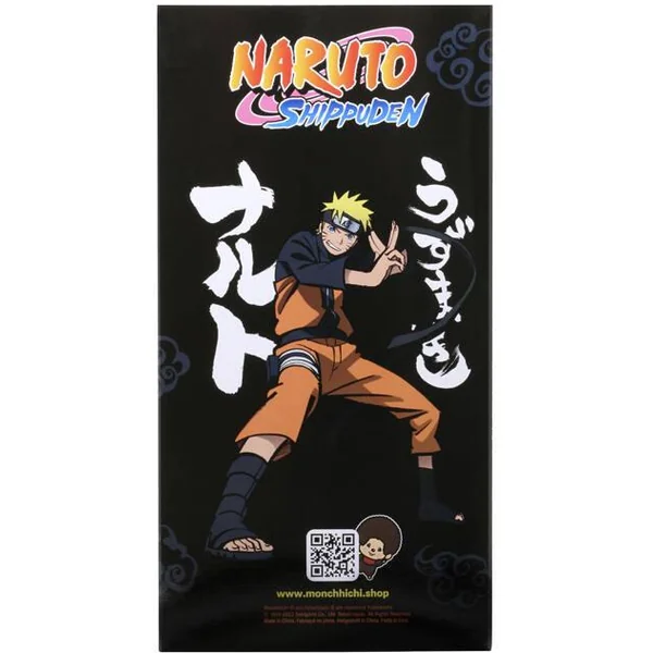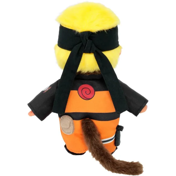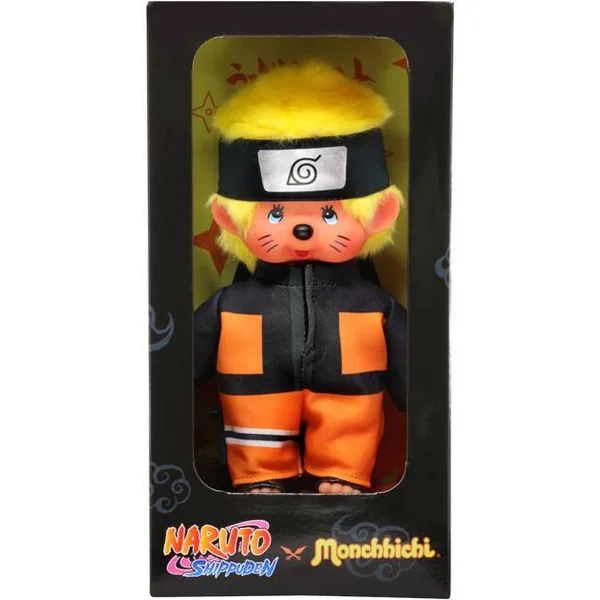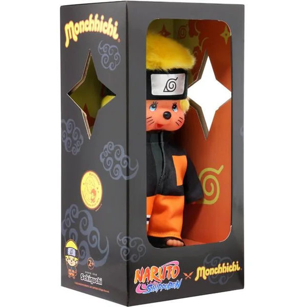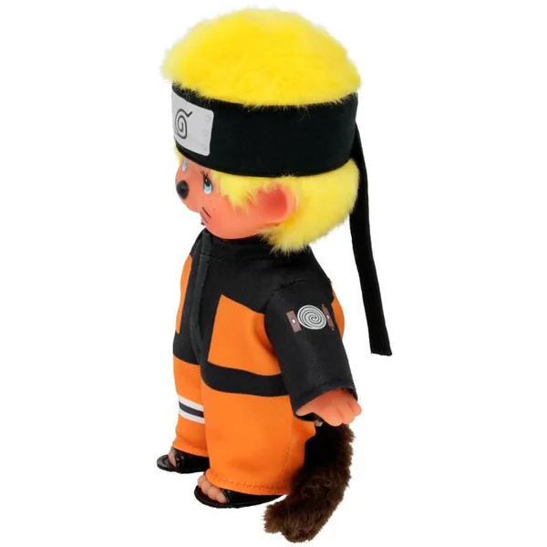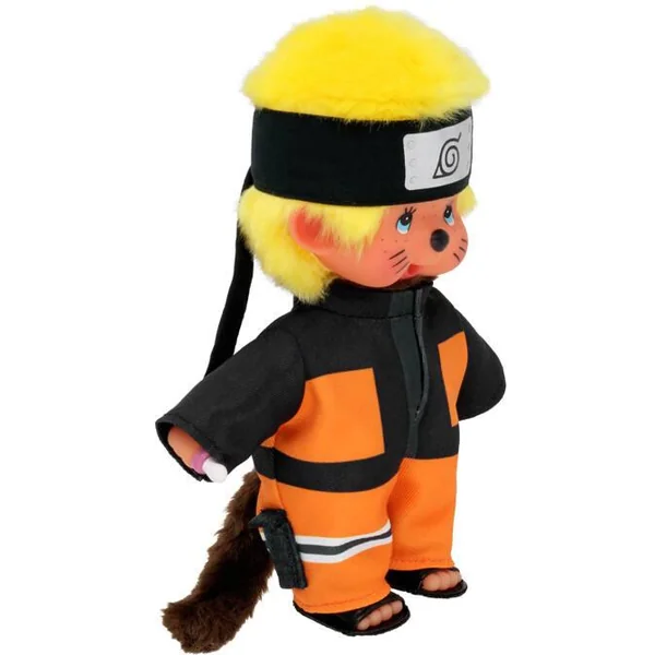 Monchichi est vêtu de l’emblématique costume de Naruto orange et porte sur la tête le bandeau de Konoha ! La transformation ne s’arrête pas là puisque Monchichi arbore un pelage jaune vif pour représernter les cheveux blonds de Naruto.