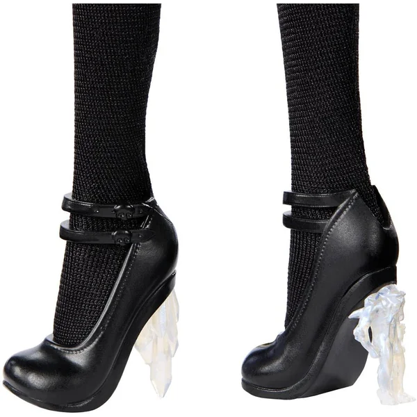 Une ceinture et des boucles d’oreilles Monster High complètent son look diaboliquement chic. Elle est prête à passer une soirée cauchemardesque dans ses chaussures mortelles ! Les talons stalactites et yéti sont un clin d’œil au thème du bal : la crise climatique et les espèces en voie d’extinction.