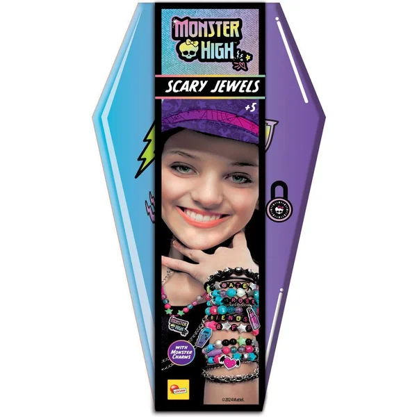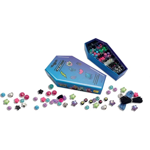 Un récipient effrayant en forme de cercueil rempli de matériel créatif pour réaliser de magnifiques bijoux Monster High. En plus des perles colorées, vous trouverez à l’intérieur de très jolis charms pour personnaliser des bracelets et des colliers à porter en toute occasion et à partager avec qui vous voulez !
