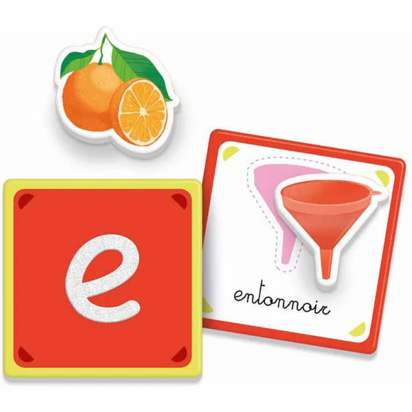 Le jeu contient également une ardoise pour écrire avec les craies et des cartes des mots à associer aux initiales.