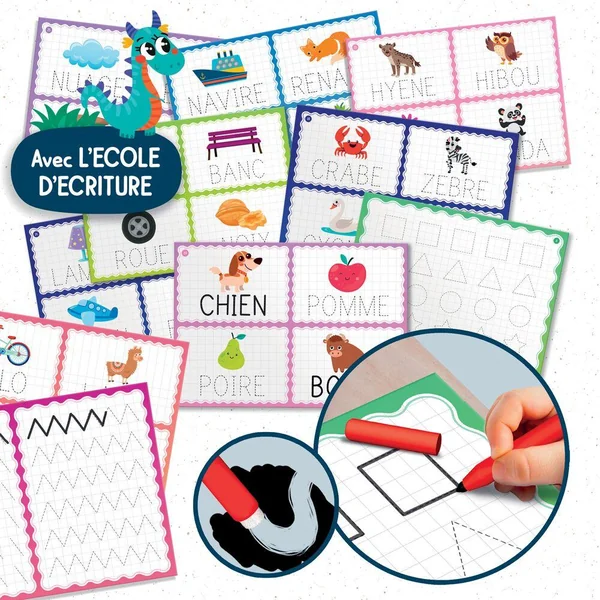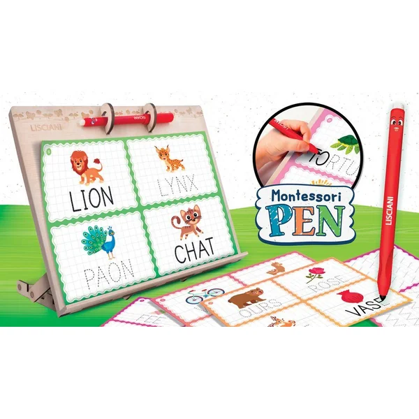 MONTESSORI PEN TABLE A DESSINER ET A ECRIRE, Un grand pupitre en bois pour une série d’activités pédagogiques basées sur la méthode Montessori. Avec de nombreux exercices d’écriture avec le stylo Montessori exclusif. 3-6 ans-