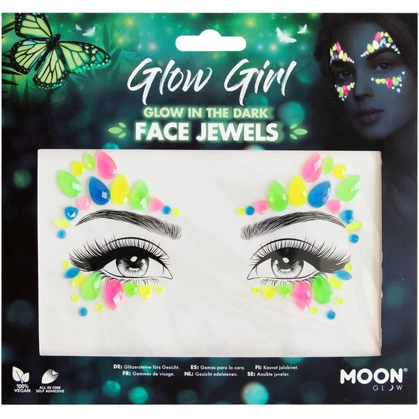 Les bijoux ou gemmes de visage Moon Glow Glow-In-The-Dark sont un incontournable pour rehausser la couleur et les effets glamour. Néon brillant le jour et brillant dans l’obscurité, leur qualité d’étoile vole la vedette.