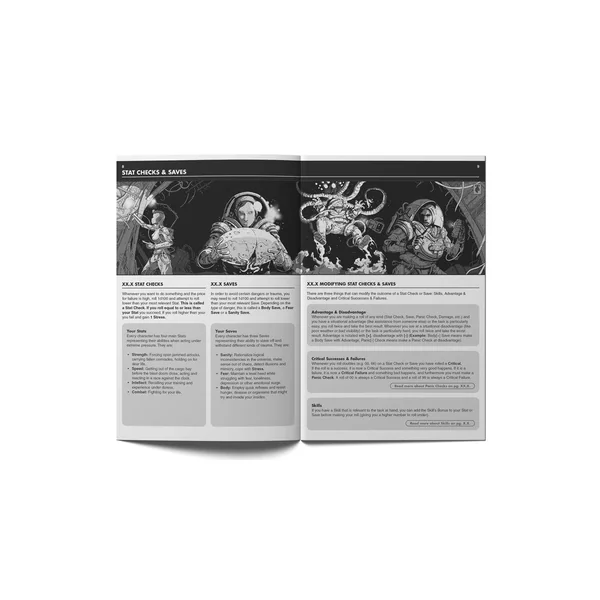 - Règles très simples – Si simples, en fait, qu’elles sont imprimées au dos du livre. En gros, Mothership est un système de lancer sous d100, où si vous voulez faire quelque chose (ou éviter qu’il n’arrive quelque chose de mauvais), vous essayez de lancer un d100 sous votre Statistique ou votre Sauvegarde pertinente.