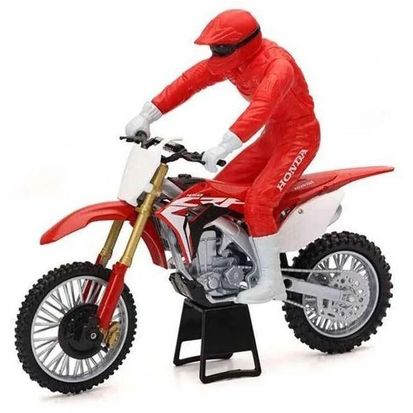 Réplique officielle en Die-Cast de la Moto Cross Honda 450 CRF échelle 1/12) pilotée par un cascadeur articulé pouvant faire des acrobaties au guidon de sa moto.