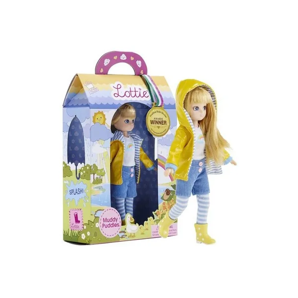 Lorsqu’il pleut dehors, Lottie Doll n’hésite pas à enfiler son imperméable et ses bottes et à se lancer dans une aventure boueuse. Lottie aime sauter dans les flaques d’eau avec ses amis et organiser une compétition pour voir qui peut faire le plus grand bruit.