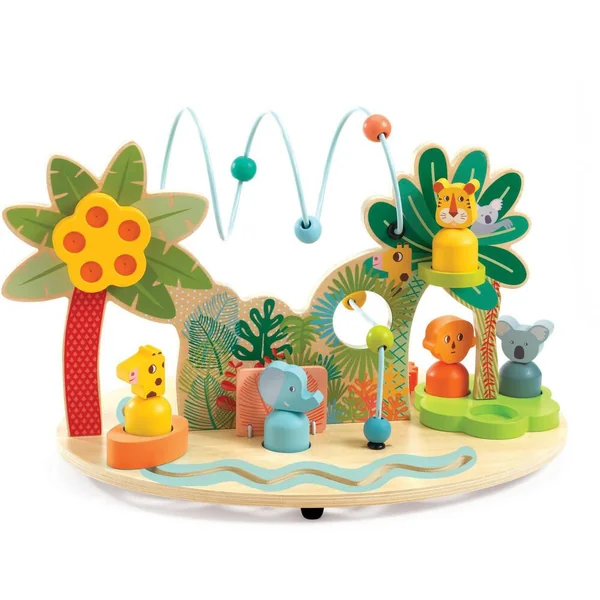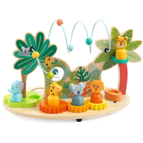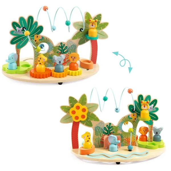 Multi Big est une grande table d’activités pour jouer avec les animaux de la jungle. De quoi s’amuser avec cette table aux 8 activités : les animaux montent dans le petit bateau poussé par l’enfant sur le circuit qui traverse le mur de jungle. Ils tournent et dansent sur les 3 engrenages, ils font la ronde sur la roue autour des lianes, ils se passent les billes d’un côté à l’autre de la jungle, ils font disparaître les billes sur le deuxième circuit, ils se posent sur les 2 perchoirs, ils ouvrent la porte pour se poser en dessous, et ils font tourner les noix du palmier qui font du bruit.