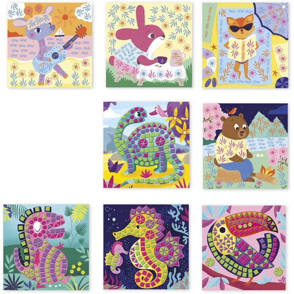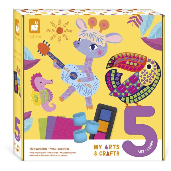 Ce coffret multiactivités propose 3 techniques différentes et permet de réaliser 8 créations. Basé sur des activités adaptées aux enfants de 5 ans, il permet de réaliser 4 tableaux à décorer à l’aide de mosaïques mousse, ainsi que 4 tableaux à compléter avec des encres à doigts et des tampons. Il faut environ 1h30 pour compléter les tableaux mosaïques et 1h30 pour les tableaux encrier. Ce kit permet de développer la motricité fine et la concentration. Il est adapté aux enfants à partir de 5 ans.