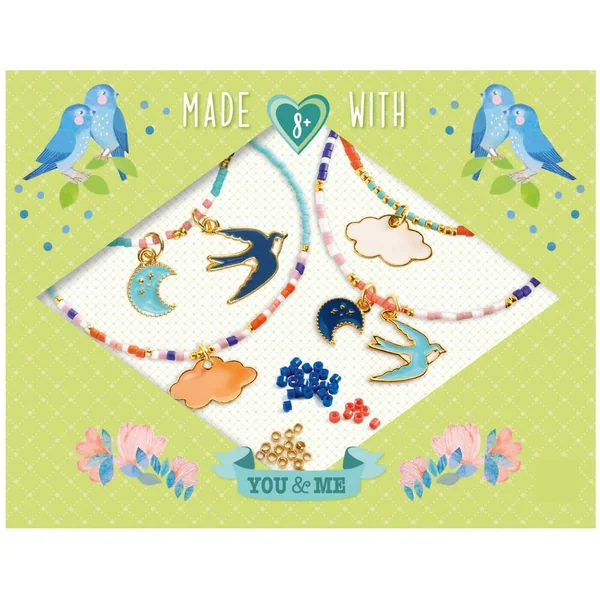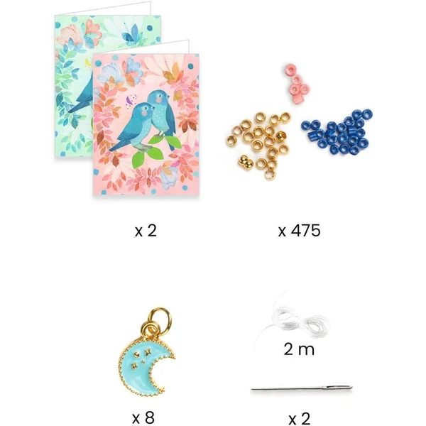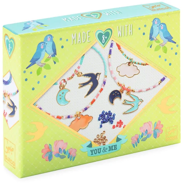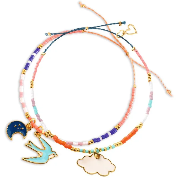 Dans une jolie boîte brillante, un assortiment de perles et de charms pour créer 2 bracelets dans les airs. 2 bijoux à conserver ou à offrir dans un joli sac en organza. Et pour encore plus de souvenirs, deux cartes illustrées sont incluses pour inscrire des mots doux.