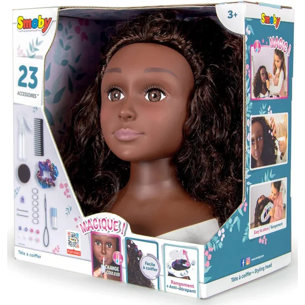 La tête à coiffer My Beauty est dotée de cheveux en nylon ultra doux et faciles à coiffer. 23 accessoires sont inclus dont 1 peigne à dents larges, 1 spray, 1 Bun, 1 scrunchie en tissu, 6 élastiques noirs, 2 pinces plates, 1 petite pince, 8 perles, 1 tube de gloss et 1 outils de coiffures pour passer les perles et faire des torsades sophistiquées. La tête à coiffer dispose d’une fonction magique grâce à son maquillage thermosensible au niveau des lèvres qui changent de couleur au contact de l’eau froide appliquée avec le tube de gloss. Le produit dispose d’un espace de rangement dans le buste pour ranger tous les accessoires ainsi que de 3 ventouses pour assurer une bonne stabilité et maintien pendant que l’enfant s’amuse à faire des coiffures.