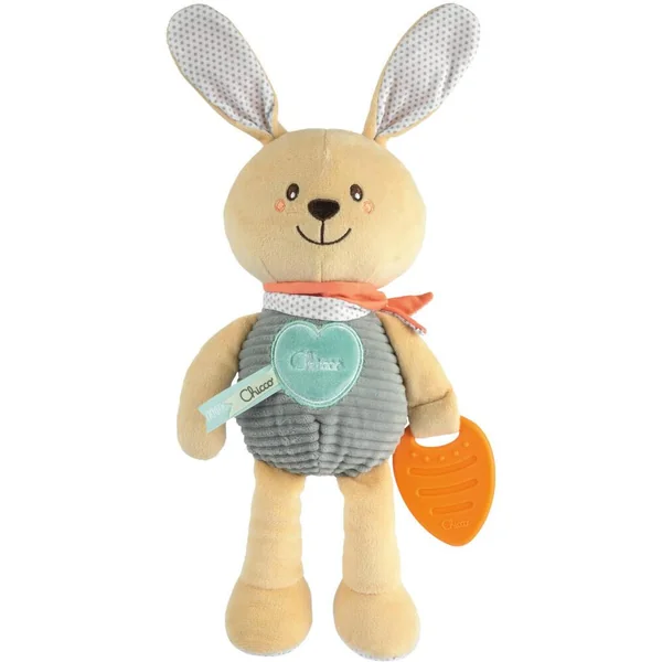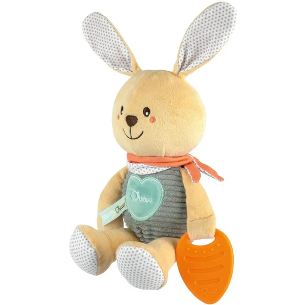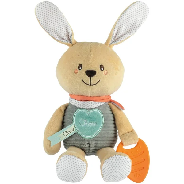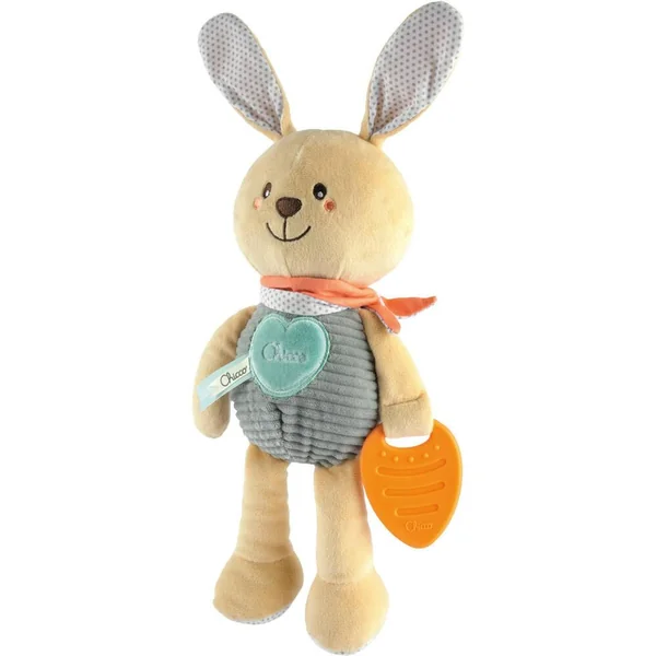 Peluche en velour côtelé avec jouet de dentition et tissu crépitant au niveau des oreilles.