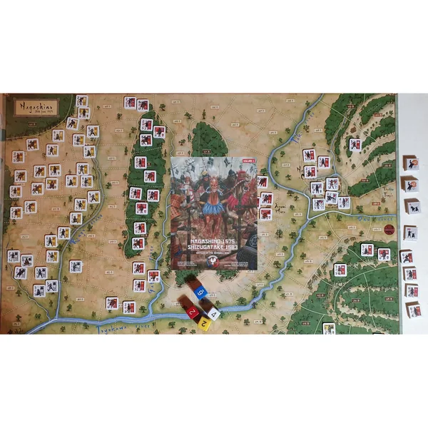 Nagashino 1575 & Shizugatake 1583 se présente sous la forme d’une boîte contenant une magnifique carte à zones recto-verso (59,4 cm x 42 cm), 216 pions magnifiquement illustrés, un livret de règles de 24 pages en français et anglais, une aide de jeu dans chaque langue et deux scénarios.