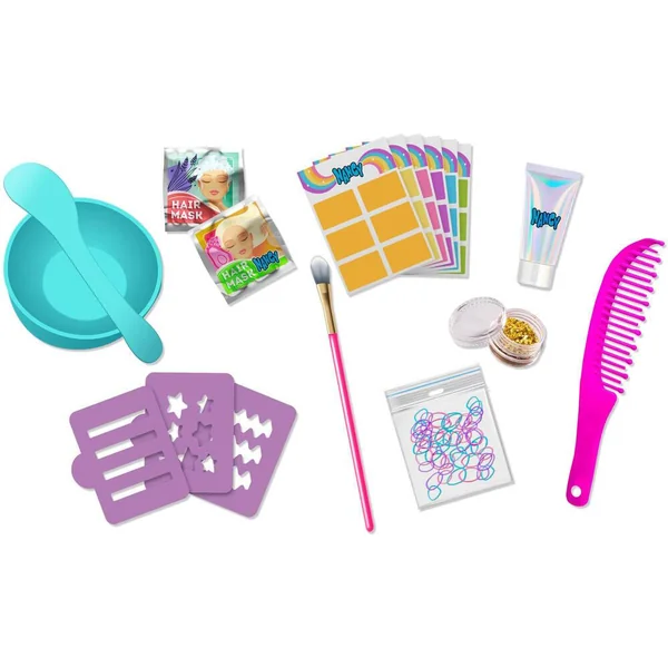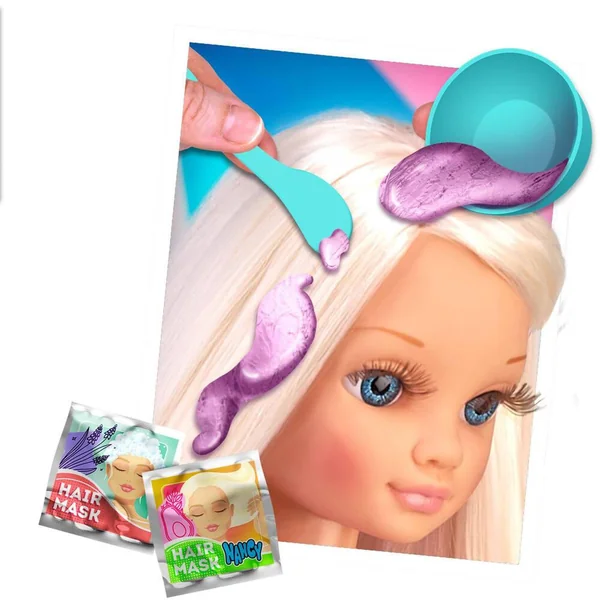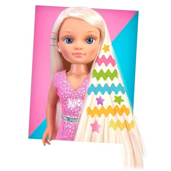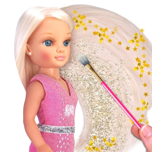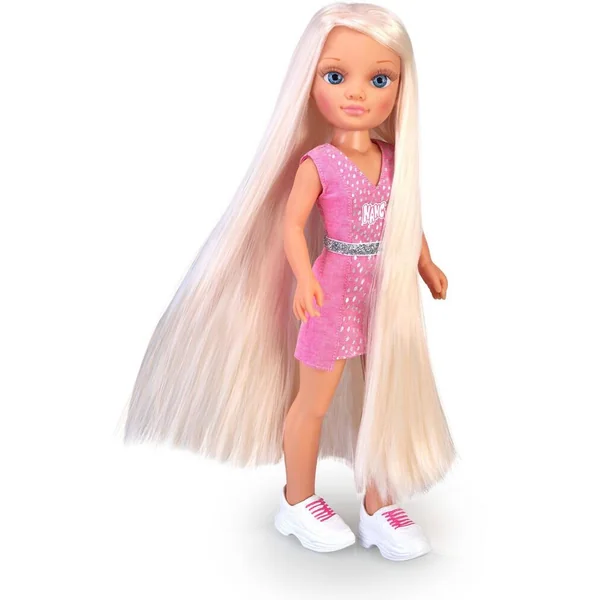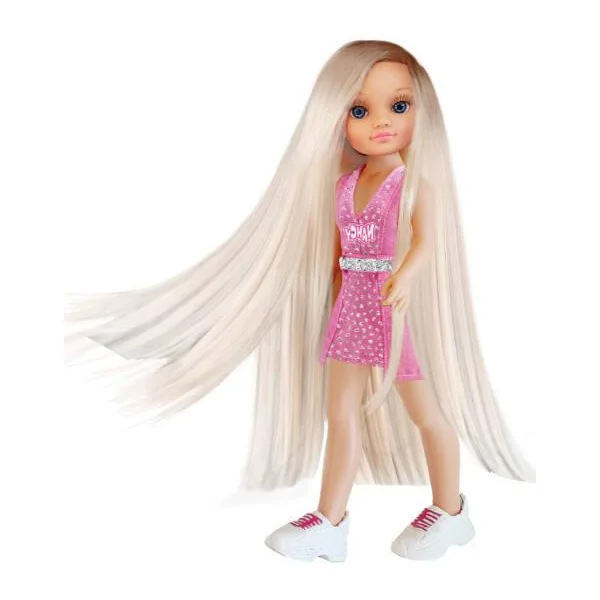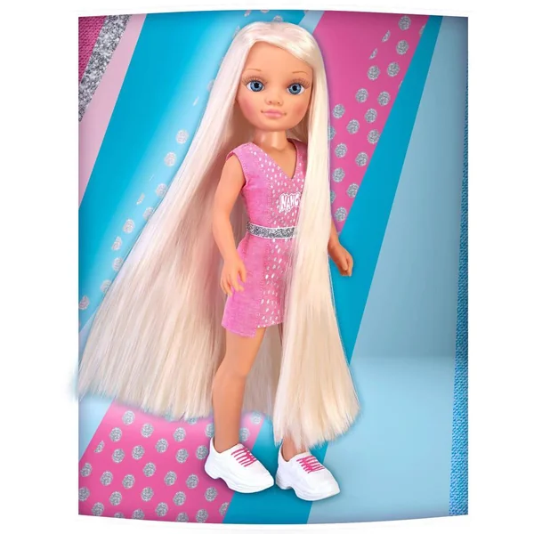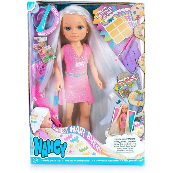 Ta Nancy avec les cheveux les plus longs jamais vu! Prends soin et décore ses cheveux! Contient des masques pour le soin, des paillettes des effets Glitter, des décorations et plein d’accessoires. Nancy porte un robe rose à paillettes avec une ceinture et des baskets! Super Fashion.