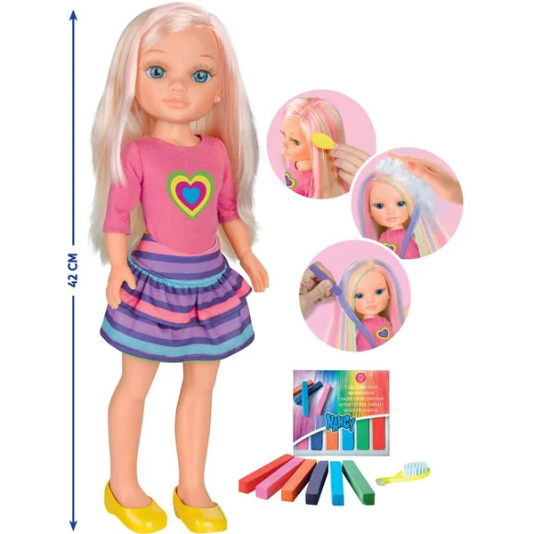 Colore les cheveux de ta Nancy selon tes envies ! Fais-lui plein de looks différents et même un look arc-en-ciel ! Trempe les craies dans l’eau et applique les couleurs sur ses cheveux ! Tu peux lui faire de super coiffures sur ses longs cheveux blonds. Lave-lui les cheveux et recommence autant de fois que tu veux ! Contient 6 craies de couleurs et une brosse. Taille Nancy : 42 cm.