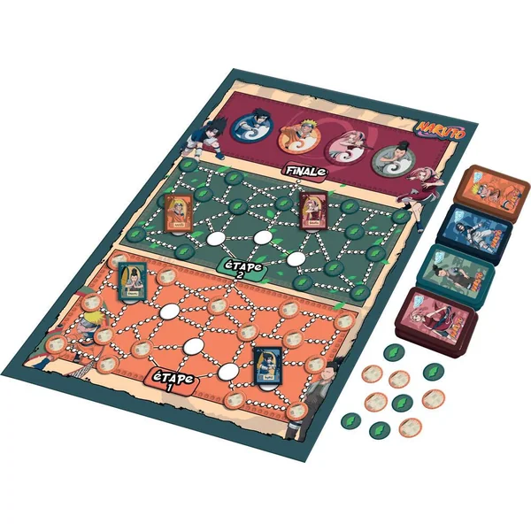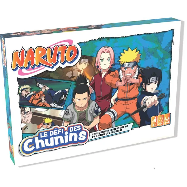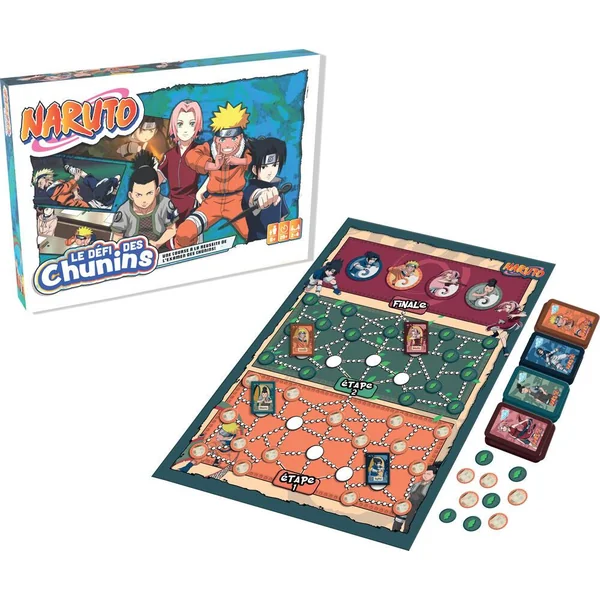 Incarne l’un des héros du manga Naruto et réussis l’examen des Chunins ! Passe les différentes épreuves en collectant la feuille de triche, le parchemin et les cartes de techniques de combat Ninja. De 2 à 4 joueurs. Durée d’une partie 25 minutes.