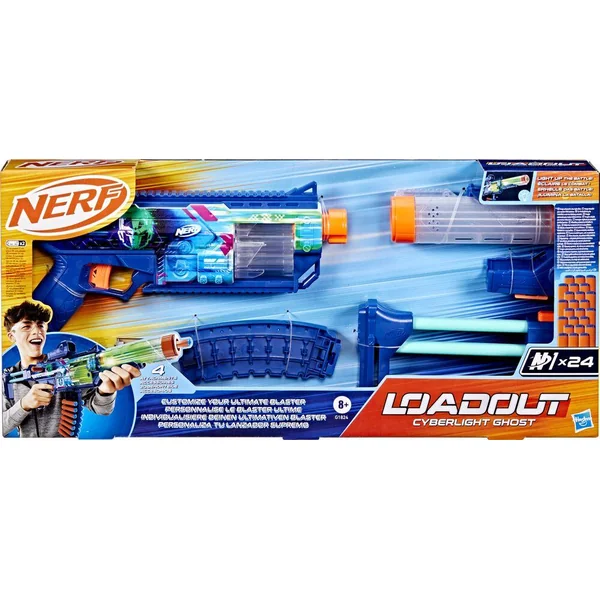 On donne vie aux jeux vidéo en personnalisant son blaster ultime ! Les blasters à fléchettes Nerf Loadout incluent des accessoires interchangeables pour mélanger et combiner avec plus de 1 000 combinaisons possibles ! Le blaster à verrou Nerf Loadout Cyberlight Ghost a des lumières LED qui font briller le canon et le barillet. Il a un barillet rotatif à 6 fléchettes et inclut un viseur, un canon, une crosse et un rangement pour fléchettes. Avec le blaster au revêtement légendaire Cyberlight Ghost, on est transporté dans l’action où on imagine des combats futuristes. La poignée peut se fixer sur les deux côtés pour accommoder les droitiers ou les gauchers. Le blaster Nerf Loadout Cyberlight Ghost inclut 24 fléchettes Nerf N1 conçues pour une précision, une vitesse et une distance extrêmes. On peut constituer sa propre collection de blasters Nerf Loadout pour des options de personnalisation infinies (vendus séparément, dans la limite des stocks). Les fléchettes Nerf N1 sont compatibles uniquement avec les blasters à fléchettes Nerf N1. Lunettes recommandées (non incluses). NERF, HASBRO et toutes les marques et logos associés sont des marques de commerce de Hasbro, Inc.