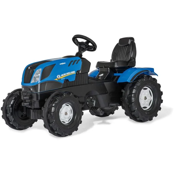 Le tracteur à pédales Rolly Toys New Holland : siège réglable, capot ouvert, attelage avant et arrière, pneus Whisper, direction de la plaque tournante, tension de chaîne réglable, transmission par chaîne protégée et guidon robuste.