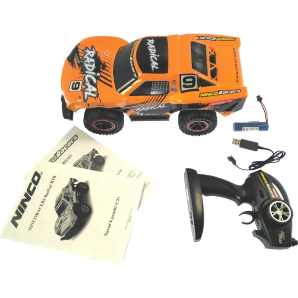 L’emballage contient la voiture télécommandée NINCORACERS Radical, l’émetteur à volant 2,4 GHz, la batterie Li-Ion 3,7 V 1300 mAh, un chargeur USB. Manuel en SK et mode d’emploi en EN, ES, PT, DE, FR, IT, DK, NO, FI, SV, NO.