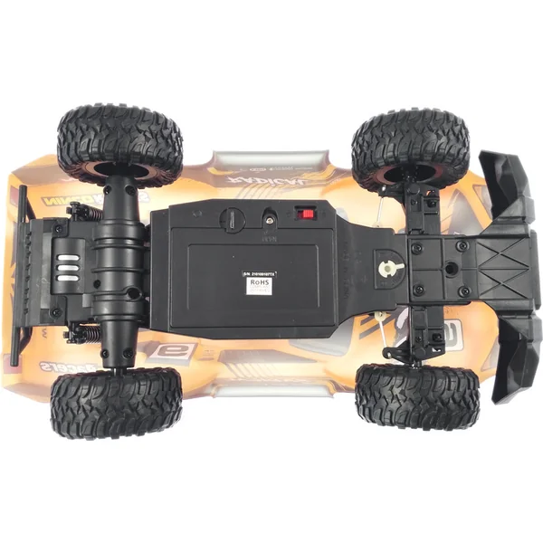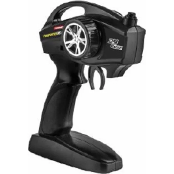 Le contrôle du modèle est assuré par un émetteur à volant comme pour les grands modèles. L’émetteur fonctionne dans la bande de 2,4 Ghz, ce qui garantit une transmission fiable du signal sans interférences ni coupures. Vous n’avez plus à craindre de casser l’antenne, celle-ci est intégrée dans le corps de l’émetteur.