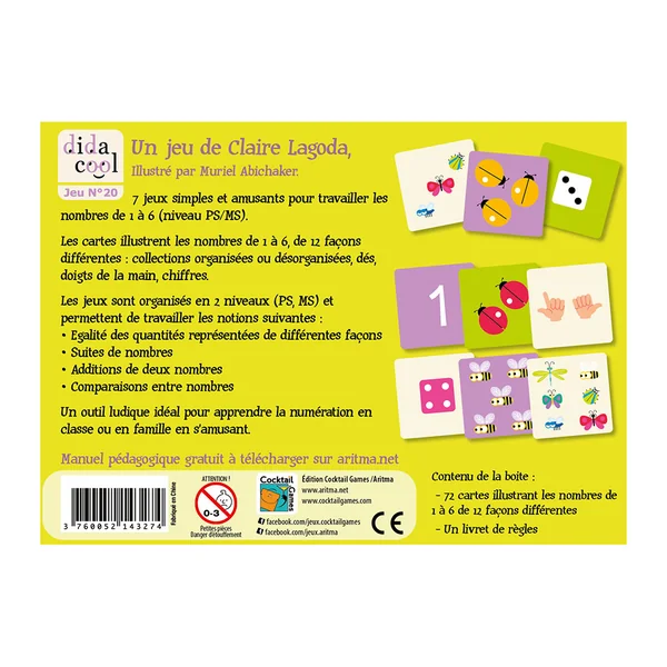 7 petits jeux pour travailler les nombres de 1 à 6 : les cartes les illustrent de 12 façons différentes (collections, dés, doigts de la main…). Les jeux sont organisés en 2 niveaux, PS et MS, et permettent de travailler la numération :