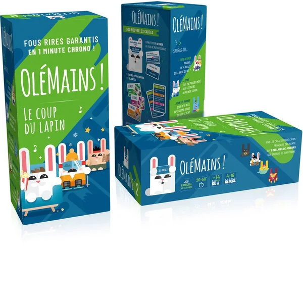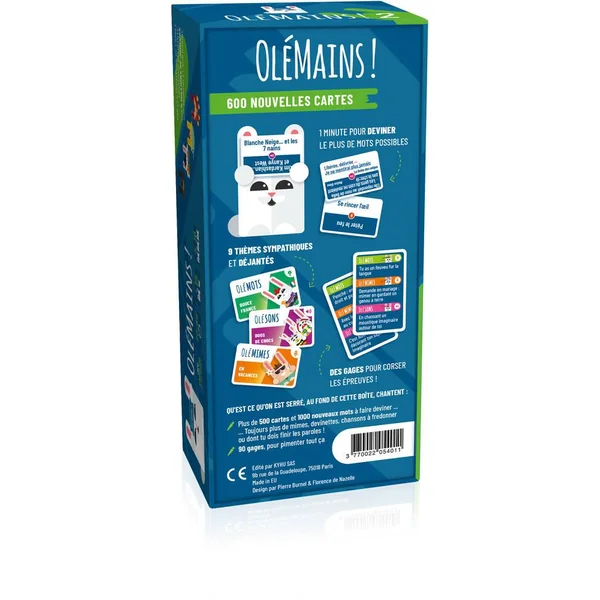 Avec le jeu de société Olémains, fous rires garantis en 1 minute chrono ! Mettez une carte sur votre front, et les membres de votre équipe vous font deviner le mot inscrit. Dès que le mot est trouvé vous en prenez une autre. Vite, vous avez 1 minute pour trouver le plus de mots possibles. Puis aux suivants, c’est l’autre équipe qui joue sur le même thème ! 9 thèmes en tout, sur lesquels chaque équipe va s’affronter : célébrités, chansons, marques, sport, il y en a pour tout le monde. Vous allez devoir mimer, fredonner, décrire.. A chaque thème, sa règle ! Alors, lequel de vos proches va révéler un incroyable talent ? Pas si vite ! Sur chaque thème, chaque équipe tire une carte gage pour pimenter l’épreuve. Un jeu d’ambiance afin d’animer vos soirées en famille ou avec des amis !