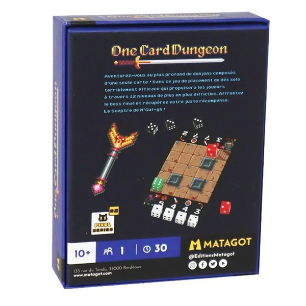 One Card Dungeon est une exploration de donjon en solo avec placement de dés jouée sur une seule carte. Combattez à travers 12 niveaux de plus en plus difficiles pour atteindre le prix final – le Sceptre de M’Guf-yn.