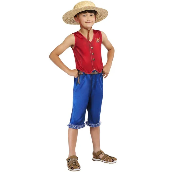 Un top sans manches imprimé avec logo One Piece. Un pantalon imprimé effet jean avec franges. Un chapeau type canotier en paille avec logo One Piece.