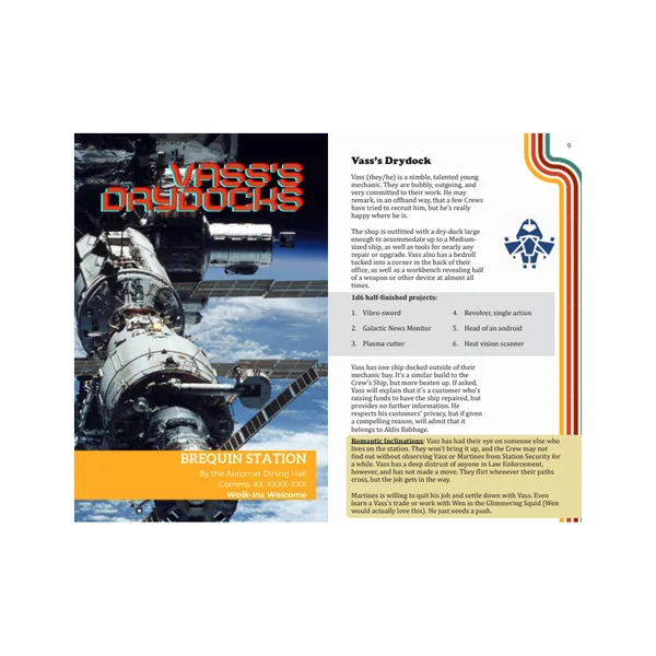 La station Brequin est une petite halte au milieu de nulle part. Elle n’offre pas grand-chose : un excellent mécanicien, un petit bar chaleureux, de la restauration rapide sans prétention et quelques logements temporaires. Depuis peu, un commerçant itinérant s’y est installé et promet quelque chose d’incroyable : une façon de rendre votre vaisseau membre de l’équipage. Un module pour votre campagne d’Orbital Blues. Il peut s’intégrer à n’importe quelle partie du jeu, et ses lieux peuvent être déplacés dans d’autres parties de votre univers. Ce module inclut également une station servant de décor à ce nouvel environnement.