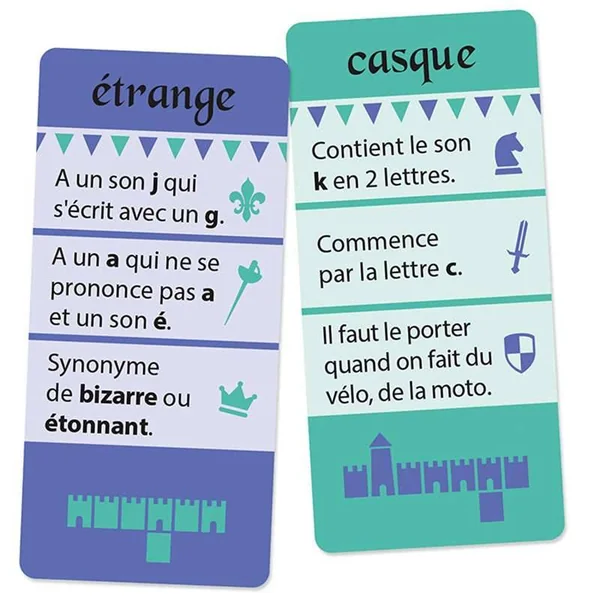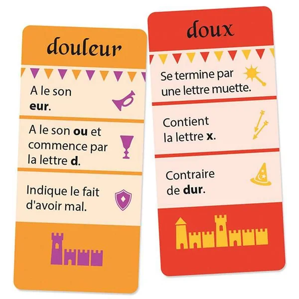 Les joueurs doivent trouver un mot à partir d’indices visuels et textuels. Les indices présents sur les cartes font réfléchir à l’orthographe du mot. Le 1er indice est lié à la difficulté orthographique travaillée. Le 2e indice est orthographique ou phonétique. Le 3e indice est une définition ou une devinette. Le 4e indice est visuel. Il se situe en bas de la carte, Il s’agit de la silhouette du mot qui est au verso de la carte. Ainsi les joueurs peuvent voir la silhouette du mot mais ne peuvent pas avoir la réponse.. La silhouette est représentée par des murailles de 4 hauteurs différentes. Un type de muraille représente un type de lettre.