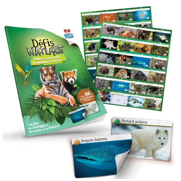 Les 96 autocollants d’animaux fournis dans l’album vous permettront de recomposer toutes les cartes Défis Nature présentes au fil des pages de l’album. Découvrez également, des anecdotes, des jeux et des activités créatives tout au long de l’album pour apprendre en s’amusant.