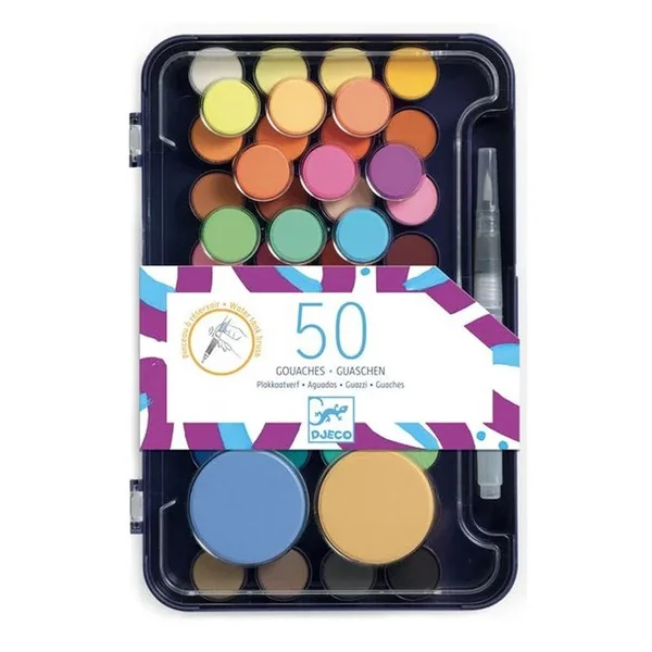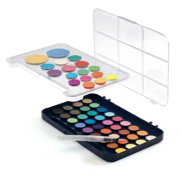 Voici une boîte de gouaches ultra complète qui présente une riche harmonie de pastilles réparties sur deux niveaux : 36 teintes standards, 8 nacrées et 9 couleurs fluo. Le plateau supérieur et la palette de mélanges sont amovibles. Le plus : ce kit comprend un pinceau à réservoir d’eau !