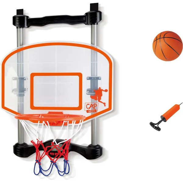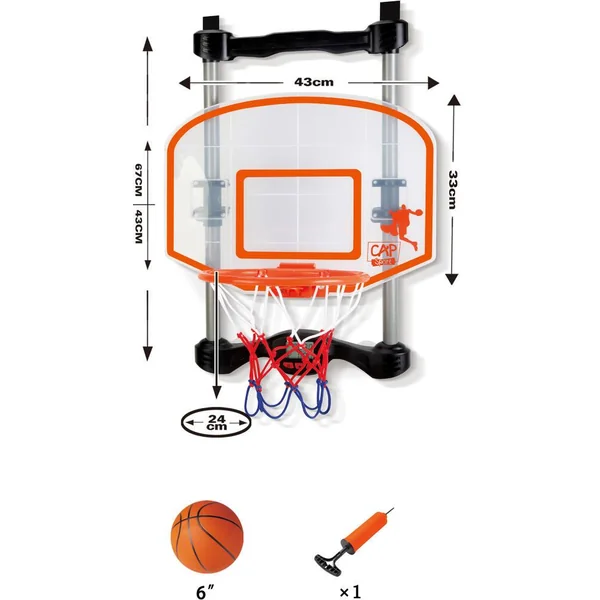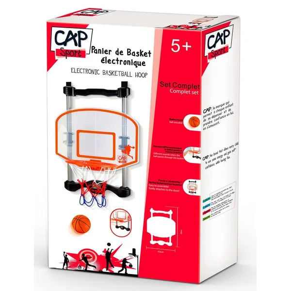 Set complet. Marque des paniers pour entendre différents sons. Enregistrement automatique du score : affichage LED. Se fixe facilement sur la porte ! Contient : 1 panier de basket, 1 ballon de basket en PVC de 15 cm et 1 petite pompe en PP (L. 15 cm) avec rangement de l’embout dans le manche. 3 piles LR03 non fournies. Facile à assembler. L’assemblage doit être effectué par un adulte. Schéma de montage imprimé sur la boîte.