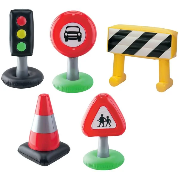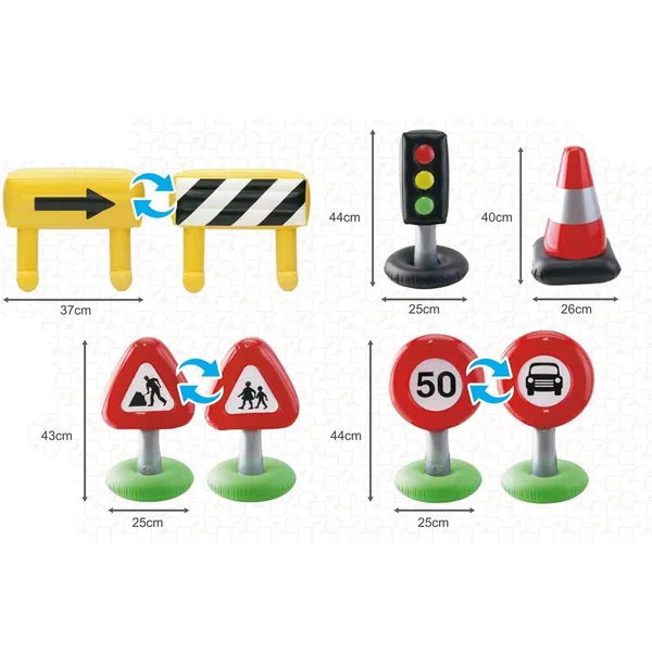 Cet ensemble comprend 5 panneaux de signalisation routière gonflable : 1 cercle, 1 triangle, 1 cône, 1 feu tricolore et 1 barrière de travaux. Le cercle, le triangle et le panneaux de construction sont reversibles.