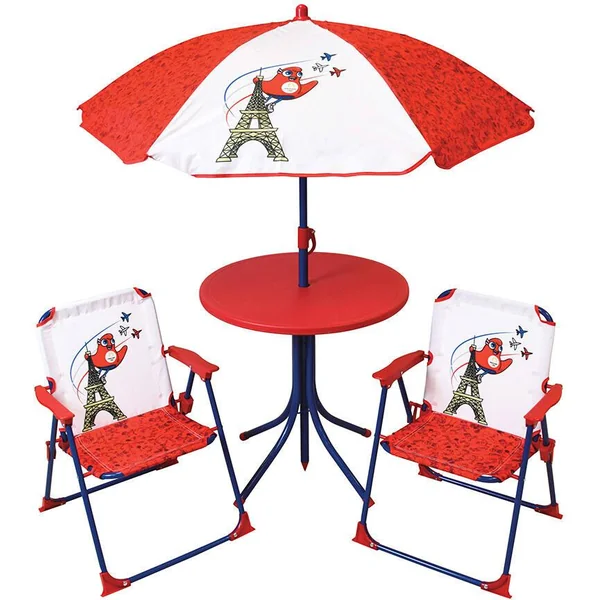 Paris jo 2024 salon de jardin table, 2 chaises, parasol.