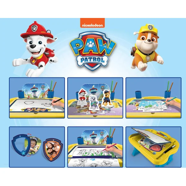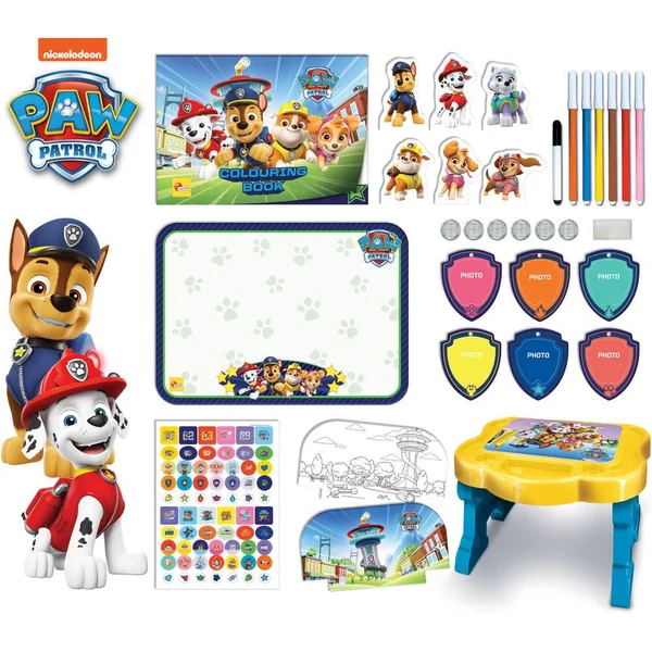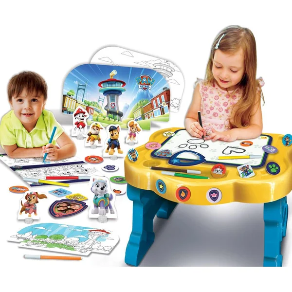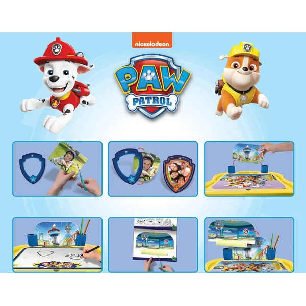 Avec la fantastique table créative Paw Patrol, vous pouvez vous amuser en jouant et en dessinant de nombreuses images contenues dans le livret. Utilisez le haut de la table pour colorier et construire un scénario interchangeable, animant les personnages en forme les plus appréciés de la série. Dans le kit vous trouverez également des carrés où vous pourrez coller vos plus belles photos, à colorier et décorer avec plein de stickers.