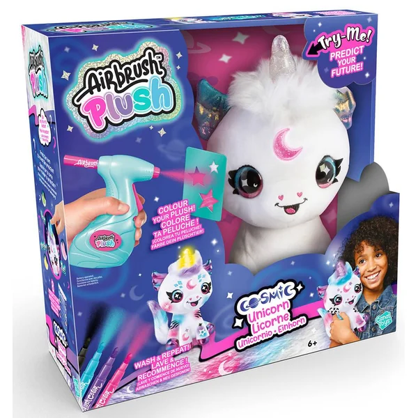 Amuse-toi à personnaliser ta peluche à l’aide de ton spray, de tes feutres et de tes pochoirs. Lave ta peluche et recommence à l’infini ! Pose une question et appuie sur sa corne : elle s’illumine ! Déchiffre la réponse grâce à la carte des prédictions !