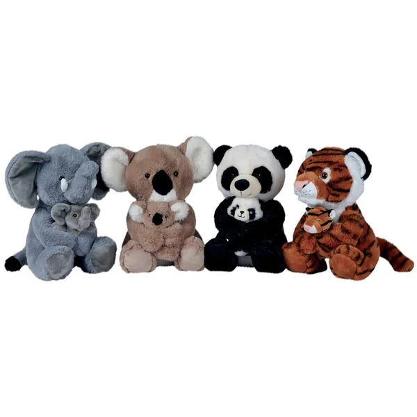 Peluche animal assis de 28 cm avec son bébé dans les bras. 4 modèles assortis : koala, panda, tigre ou éléphant. Peluche toute douce. Le bébé est fixe (non détachable). 100% polyester. Lavage en surface. Instructions sur cartonnette.