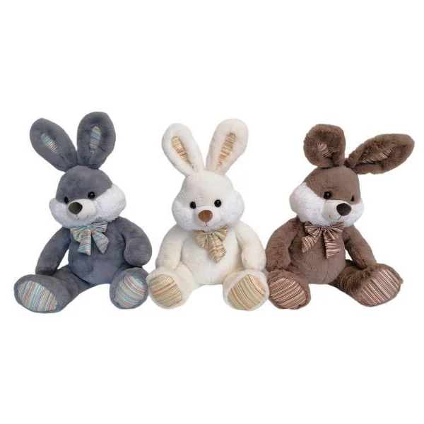 Peluche lapin de 60 cm (38 cm assis). 3 coloris assortis : brun, blanc ou gris. Peluche toute douce. 100% polyester, nettoyage en surface.